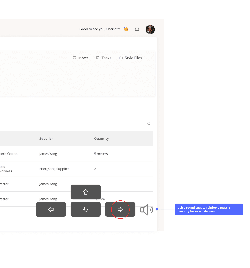 To support the learning process and reinforce desired behavior, we can leverage the power of sound: using our custom-designed audio cues to create positive emotions when the correct shortcut is used for switching between sides.