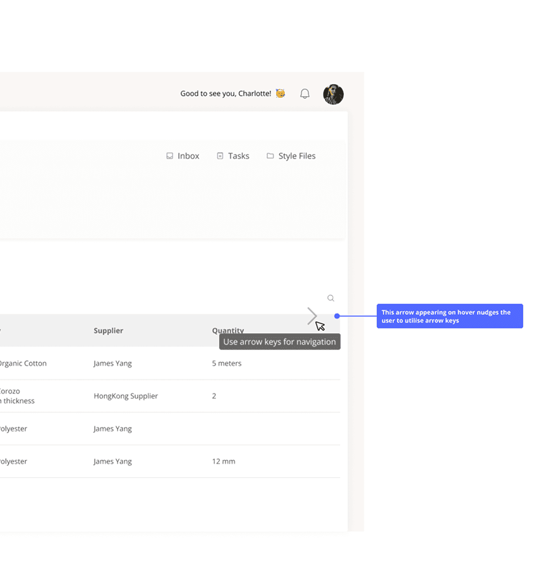 To support learnability, we introduce subtle visual cues: when users hover near the edge of the product view, an arrow appears to suggest horizontal navigation. Additionally, a brief tooltip explains that keyboard shortcuts can be used to switch between products - helping users quickly understand and adopt the new interaction.