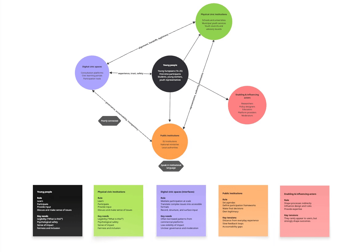 This project examines how young Europeans (16–25) encounter and participate in civic processes through digital public spaces, focusing on how design of structure, governance, and interaction influences trust, understanding, and willingness to participate.