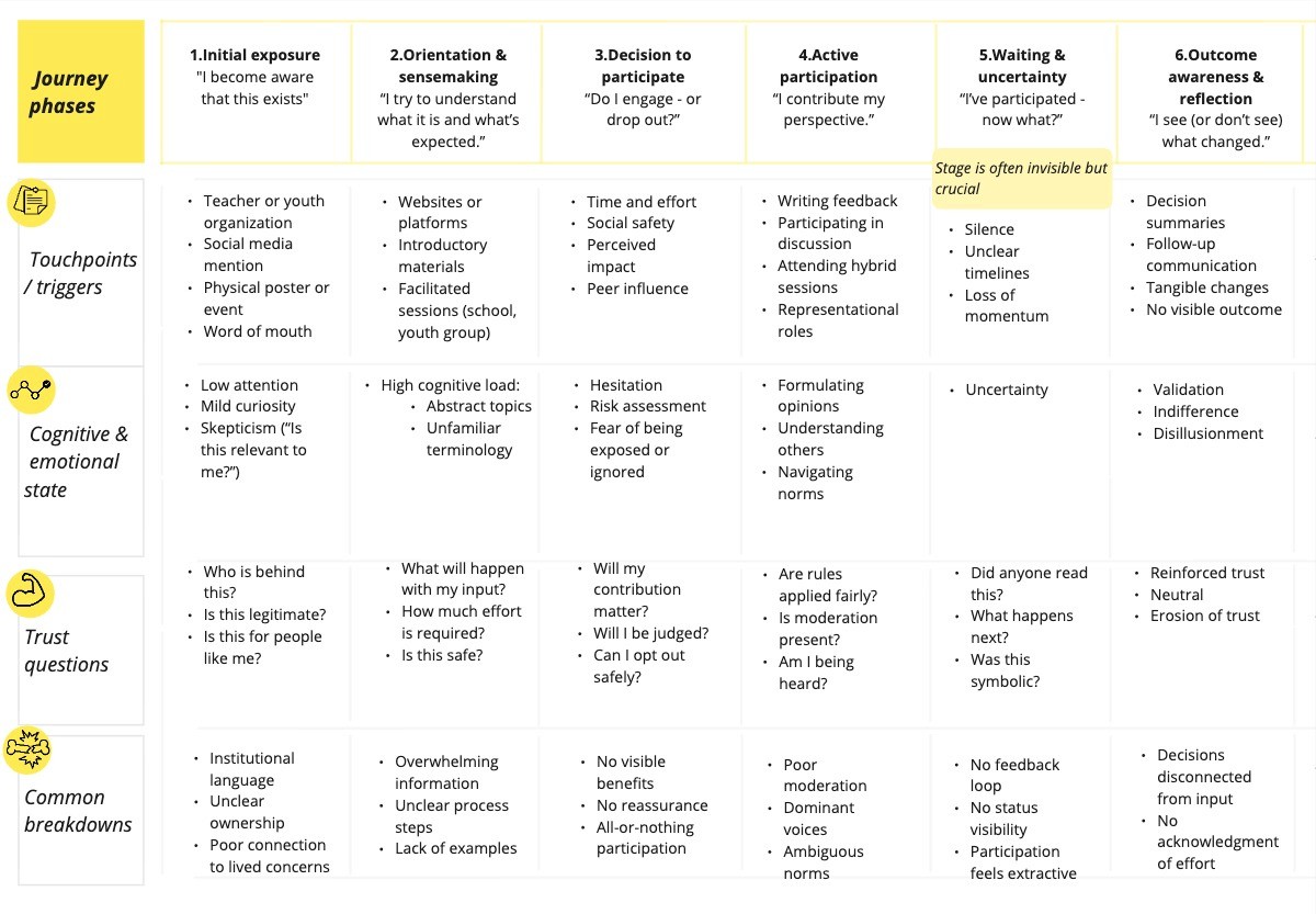 Across the participation journey, opportunities for design emerge around how young people first encounter civic processes, how safe and approachable participation feels, how clearly progress and outcomes are communicated over time, and how digital participation connects to physical civic life.